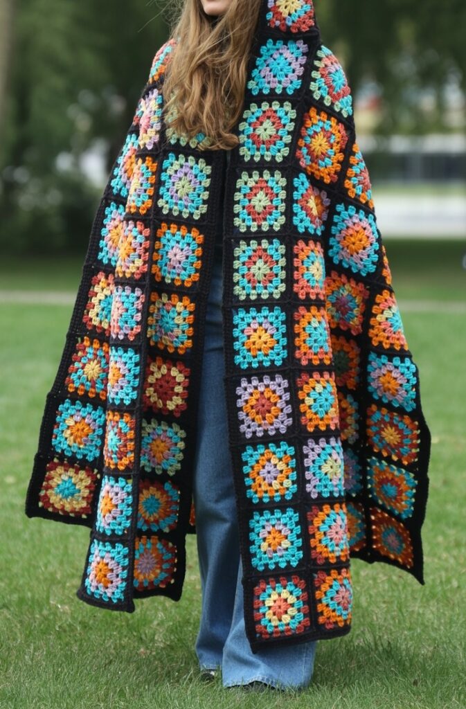 This makes the cloak suitable for beginners who are learning granny squares, as well as advanced crocheters who enjoy experimenting with colorwork and stitch patterns.