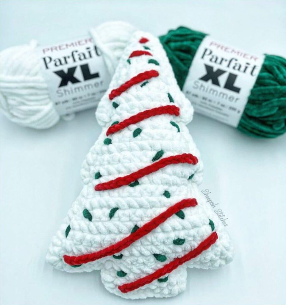 For the main color, choose white or cream to represent the “frosted cake.” To mimic the famous design, you’ll need a small amount of green yarn for the zigzag “icing lines” and red yarn for the decorative “sprinkles.” If you want to give your tree a snowy shimmer, consider using yarn with metallic threads or add a strand of sparkly yarn while crocheting.